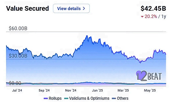 Rollup 中的总锁仓价值已从 2023 年初的约 100 亿美元增长至 2025 年 6 月的 428 亿美元 (L2Beat)。