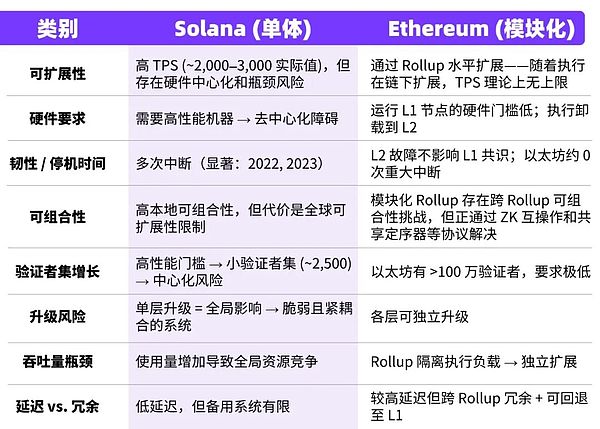 以下是 Solana 单体架构劣势与以太坊模块化优势的直接对比: