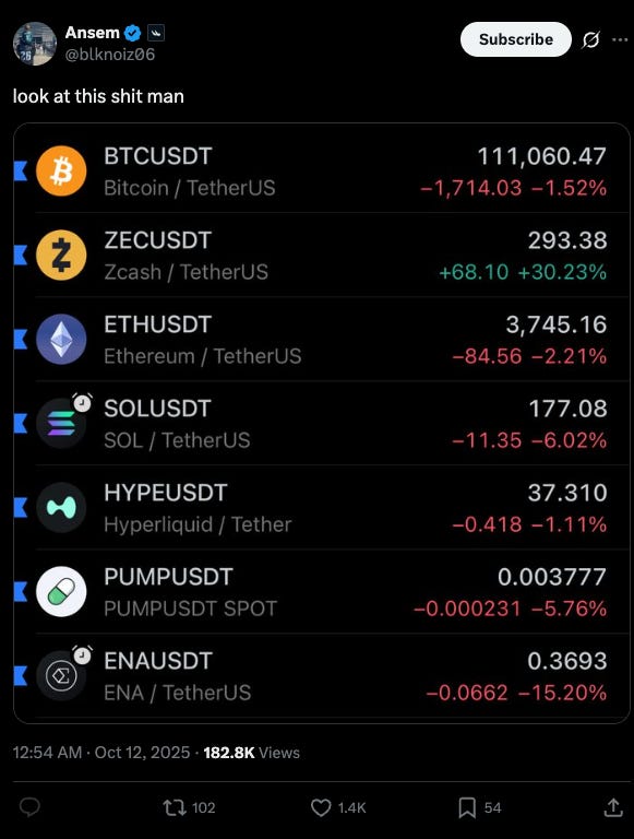 交易量正大幅飙升(日交易量约 12.8 亿美元),大型参与者似乎在悄然布局。在加密货币历史上规模最大的清算潮(超过 190 亿美元强制清算)期间,ZEC 是少数逆势上涨的资产之一,这是明确的积累信号。