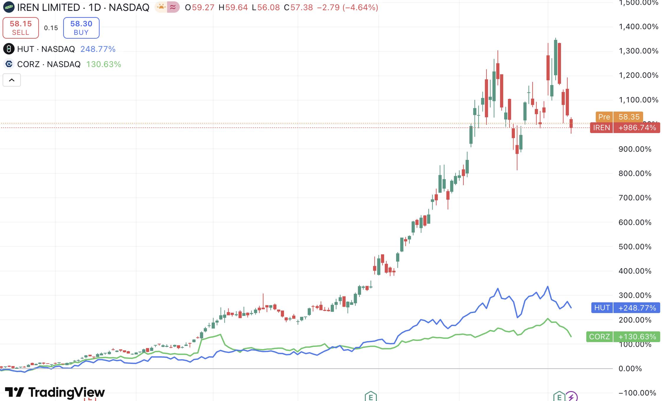 图:IREN年内上涨987%,HUT年内上涨249%,CORZ年内上涨131%