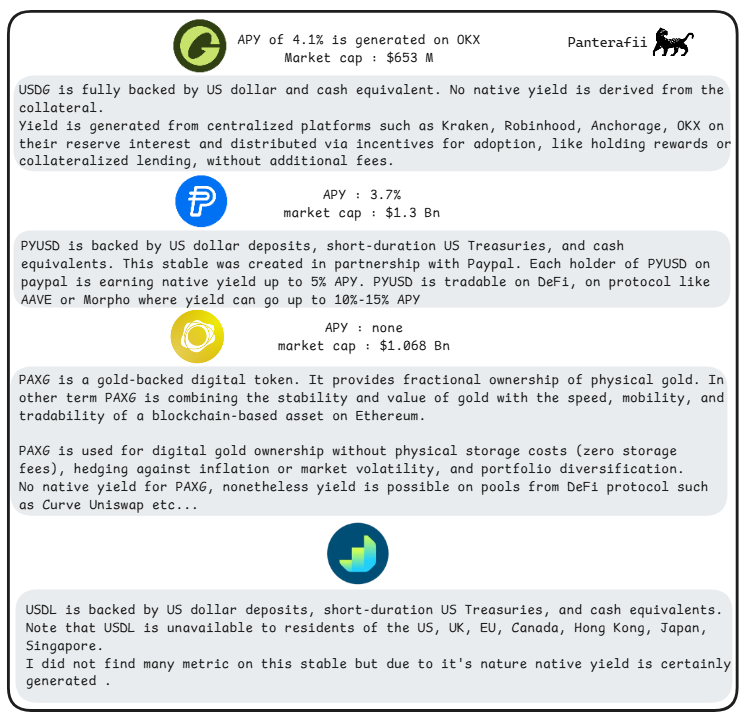以法币或等值资产 1:1 支持,收益主要来源于储备金(如国债)。基础收益通常不会分发给用户,而是用于企业运营。