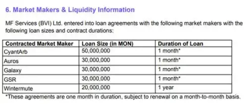 - MF Services (BVI) Ltd. 已与 CyantArb、Auros、Galaxy、GSR、Wintermute 五家做市商签订贷款协议,累计出借 1.6 亿枚 MON 代币。其中,Wintermute 的出借期限为 1 年,其余各家为一个月,可按月续签