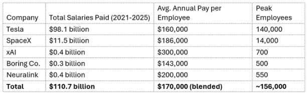 过去五年,马斯克的公司累计支付了高达 1107 亿美元的薪资,这笔钱足以让洛杉矶的每位居民获得 2.7 万美元。这些收入支撑着超过 20 万名员工的生活,从制造电动皮卡 Cybertruck 的焊接工,到设计火星火箭的软件工程师。不仅是高层管理人员受益,特斯拉的平均年薪约 16 万美元,足以让员工安家立业、子女就学,并带动当地餐饮等行业的繁荣。