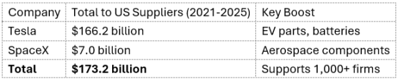 马斯克不仅聚焦于自身企业,更通过供应链将财富扩散至全美。仅特斯拉就向美国供应商采购了 1660 亿美元的电池、芯片和钢材,有力地支持了密歇根州和内华达州的制造业。SpaceX 秉持「美国制造」原则,贡献了 70 亿美元的采购额,主要面向国内供应商采购火箭级合金和航空电子设备。再加上 xAI,总额达到 1730 亿美元的采购惠及了数千家中小企业,不仅创造了大量间接就业,还增强了美国供应链抵御全球风险的能力。