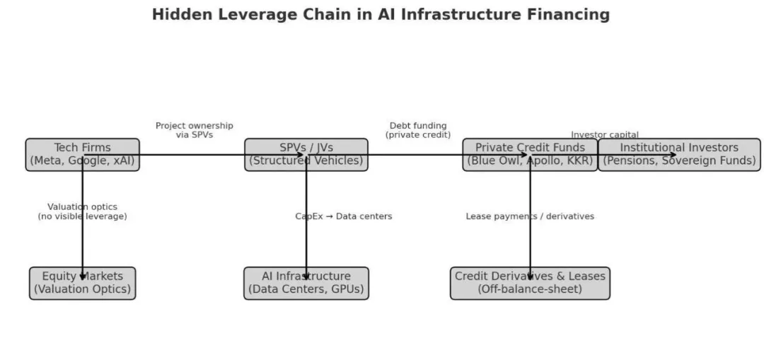 (最终风险承担者)养老基金/ETF投资人/主权基金 → (中介机构)私募信贷基金 → (融资实体) SPV 或 Neocloud (如 CoreWeave) → (最终使用者) 科技巨头 (如 Meta)