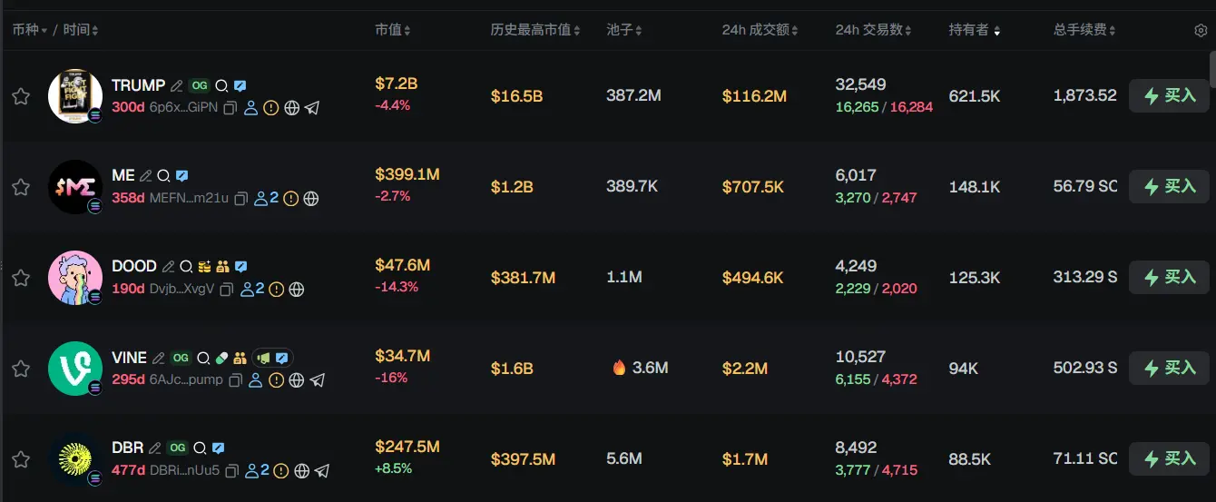 过去 24h Solana 热门代币前五依次为:TRUMP、ME、DOOD、VINE、DBR