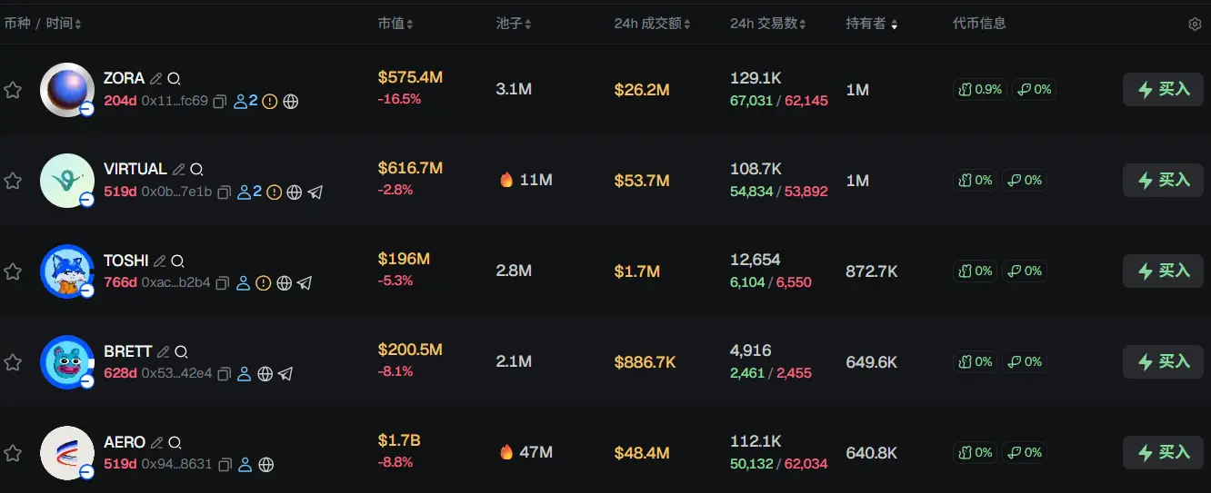 过去 24h Base 热门代币前五依次为:ZORA、VIRTUAL、TOSHI、BRETT、AERO