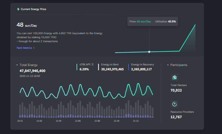截至11月13日,JustLend DAO能量租赁每日价格为48 SUN,仅需4.8TRX就能租赁10万单位能量(等效于质押10450 TRX所获能量),足以覆盖两笔合约交易,累计参与用户已突破 7 万,成为生态内高频刚需的核心服务之一。