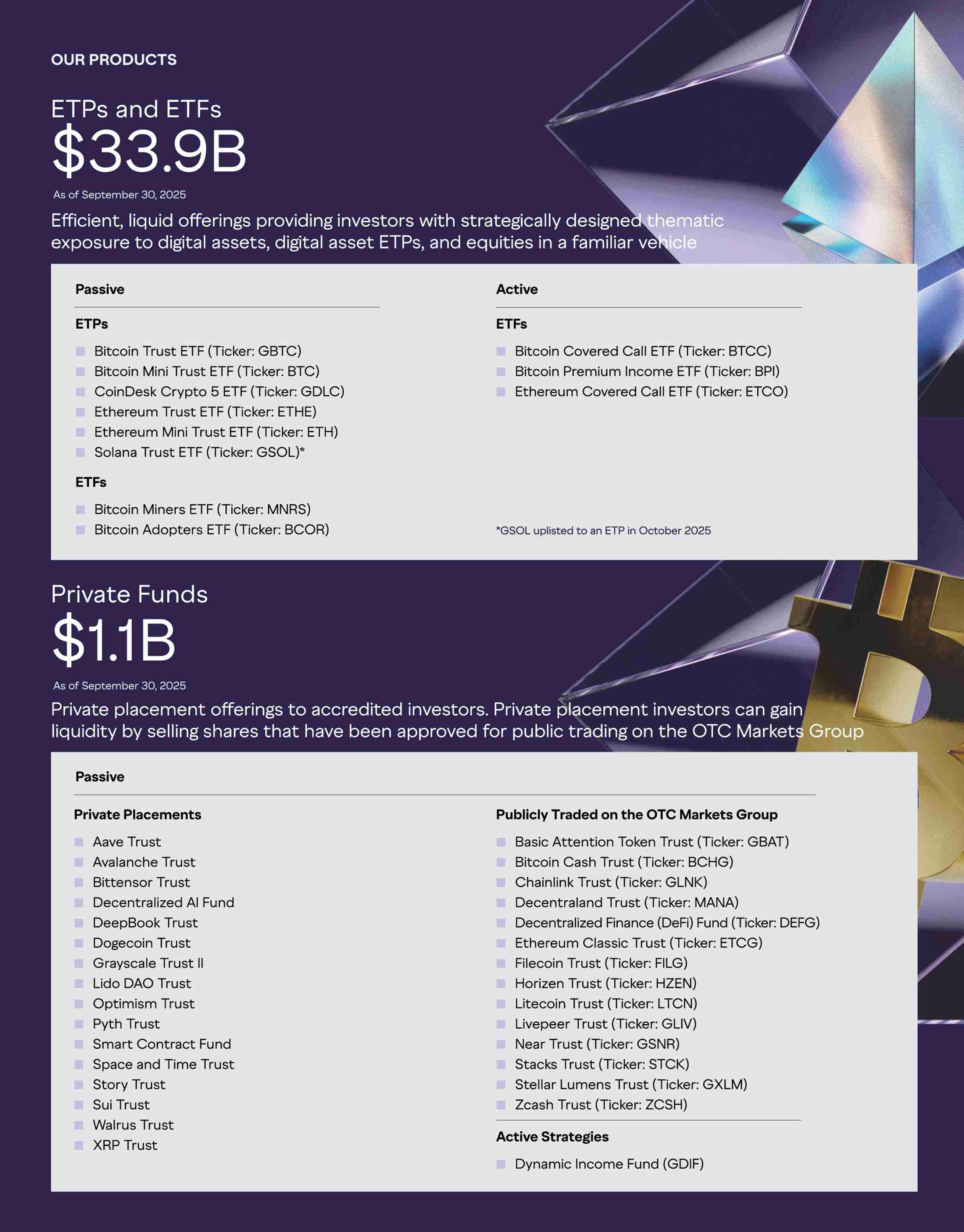 S-1 文件显示,截至当地时间今年 9 月 30 日,灰度总资管规模达到了 350 亿美元,实现了加密货币资管规模的全球第一。旗下数字资产投资产品超过 40 种,覆盖了超过 45 种加密货币。350 亿美元中包括了管理规模达 339 亿美元的 ETP 和 ETF(主要是比特币、以太坊、SOL 相关产品)以及规模为 11 亿美元的私募基金(主要是山寨币投资产品)。