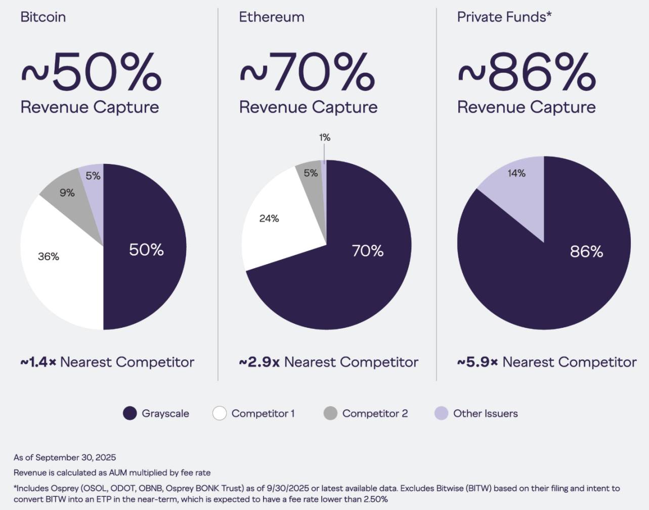 在拓展分销渠道方面,灰度披露称,目前已完成了三家 AUM 总计达 14.2 万亿美元的券商的尽职调查,并于本月在一家拥有超过 17500 名财务顾问,咨询和经纪资产规模超过 1 万亿美元的大型独立经纪交易商的平台上上线了比特币和以太坊迷你 ETF。今年 8 月,灰度与拥有 6700 家咨询公司组成的网络的 iCapital Network 达成合作,根据协议,灰度将在未来通过旗下主动管理策略为网络中的公司提供数字资产投资渠道。