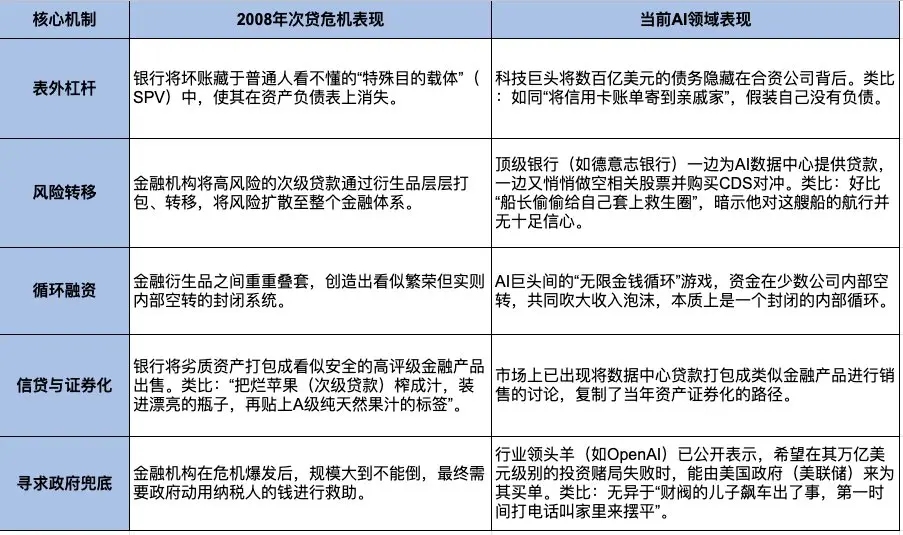 当前的金融现象并非孤立存在。当我们将 Oracle 的债务警报与 AI 巨头间的资本循环拼凑在一起,对于经历过 2008 年金融海啸的市场观察者而言,会产生一种「似曾相识」的不安感。以下系统性地剖析当前 AI 领域的金融操作与导致 2008 年全球金融危机的核心要素之间的五个关键共同点,揭示历史可能正在以新的形式重演。
