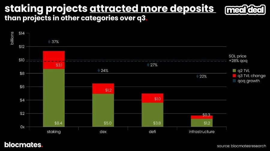 从 TVL 增速来看,质押类产品是三季度 Solana 应用中的绝对亮点,币安和 Bybit 提供的质押 SOL 以及 @Sanctumso 的产品在三季度均录得超过 50% 的增长。