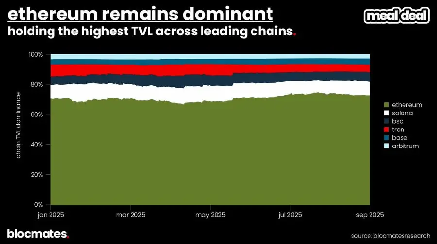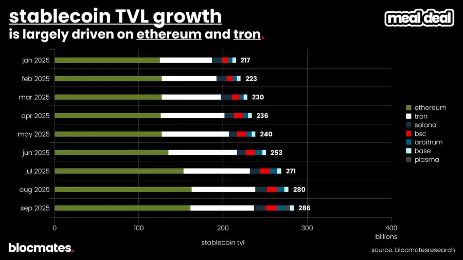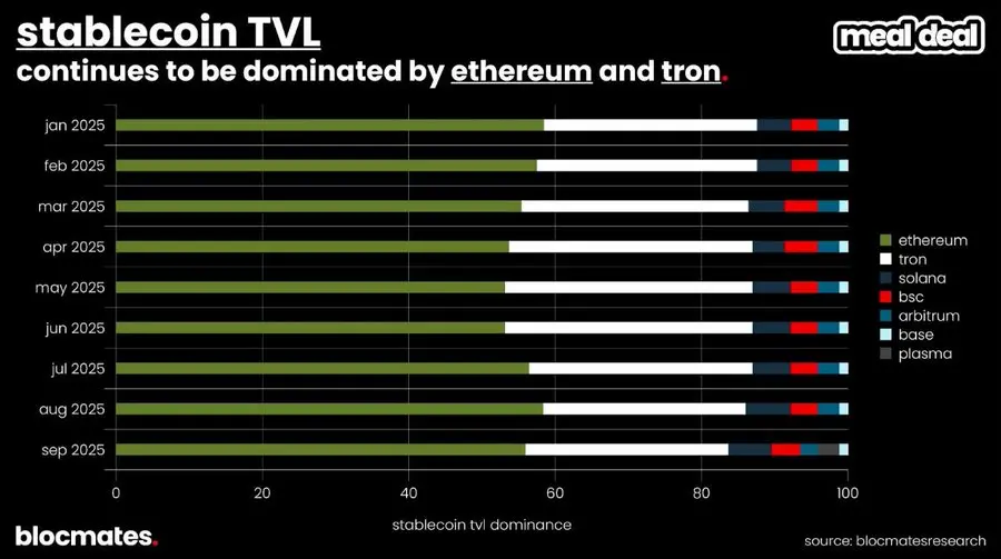 进一步拆解稳定币 TVL 占比就会发现,以太坊与 Tron 在过去几个季度里几乎稳居主导,而一些新出现的应用链——例如 @Plasma——开始逐渐挤入这个格局。