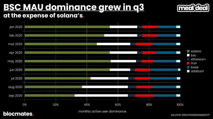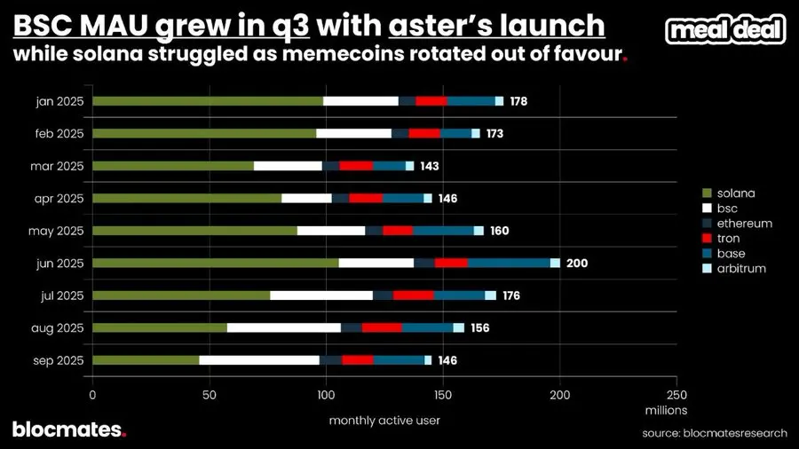 就用户规模而言,Binance Smart Chain 在三季度凭借与 CZ 关联的永续 DEX——Aster——夺走了最多的注意力。大量用户要么在初夏选择离场,要么从 Base 与 Solana 迁移至 BSC。