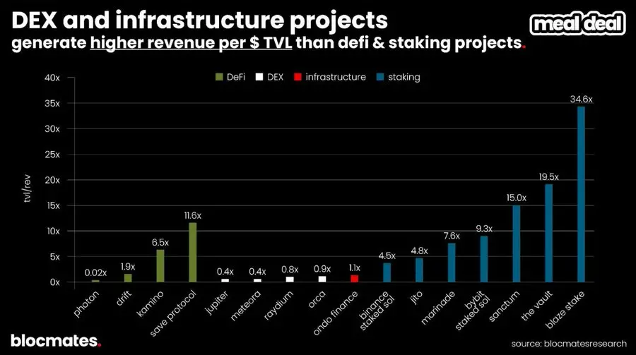 质押产品的短板在于盈利能力较弱:平均而言,一个质押协议需要 21.7 倍的 TVL 才能达到本次样本中 DEX 的平均收入水平。这再次说明了一个事实——在加密世界里,投机者贡献的利润远高于储蓄者。