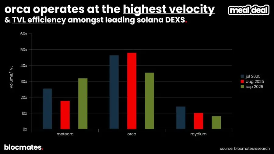 在 DEX 赛道中,@Orca_so 一直保持着 TVL 效率(即“交易速度”)的领先地位。在给定的流动性规模下,Orca 上每一美元的交易频率最高。