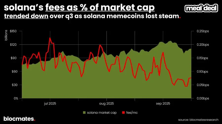从数据来看,随着交易者从 Meme 投机转向永续合约,Solana 的链上收益指标出现明显影响:链上费用占 SOL 市值的比例自 7 月高点以来已下滑超过 60%。