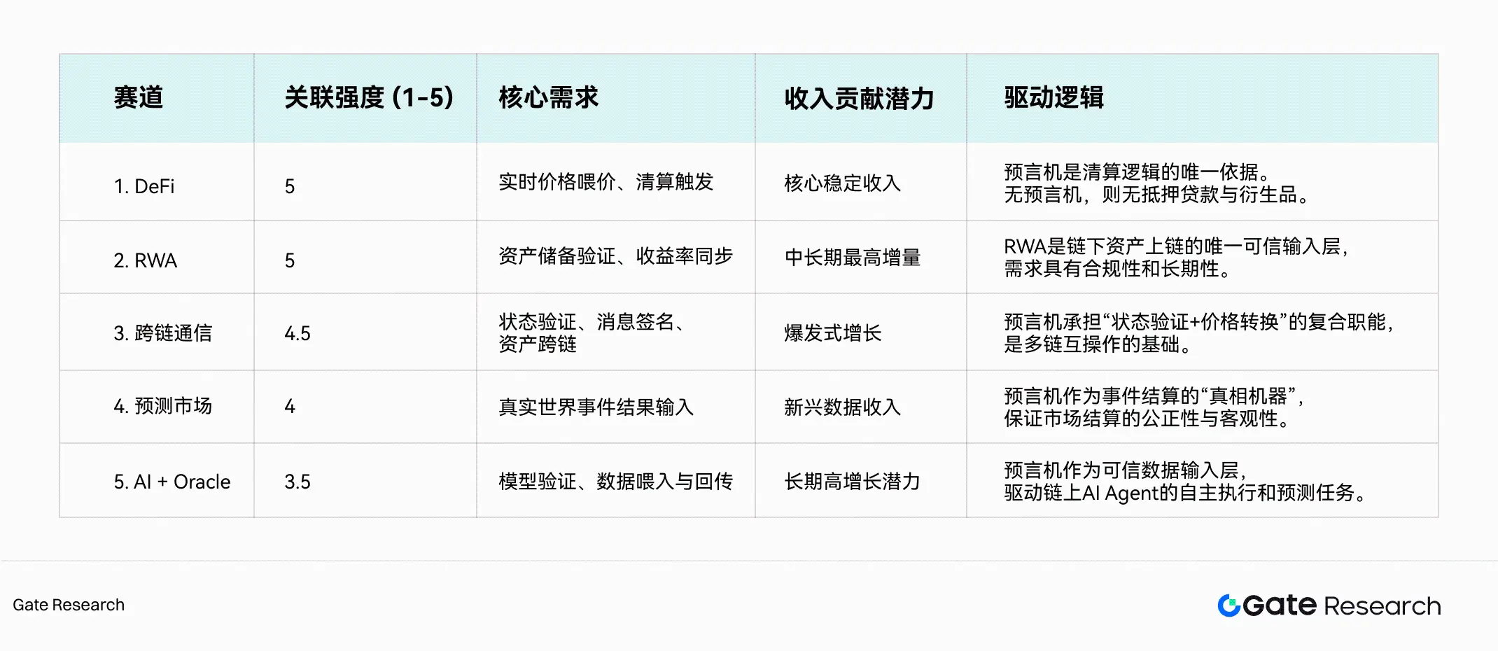 基于前述三大驱动因素,并结合当前预言机的调用量、收入贡献潜力与战略协同度,本报告将预言机生态的主要服务对象划分为五大核心赛道:DeFi、RWA、跨链通信、预测市场及 AI+Oracle。其中,DeFi 是预言机的原生主战场,RWA 是机构化增长引擎,而跨链通信、预测市场与 AI+Oracle 则构成新兴增长曲线。