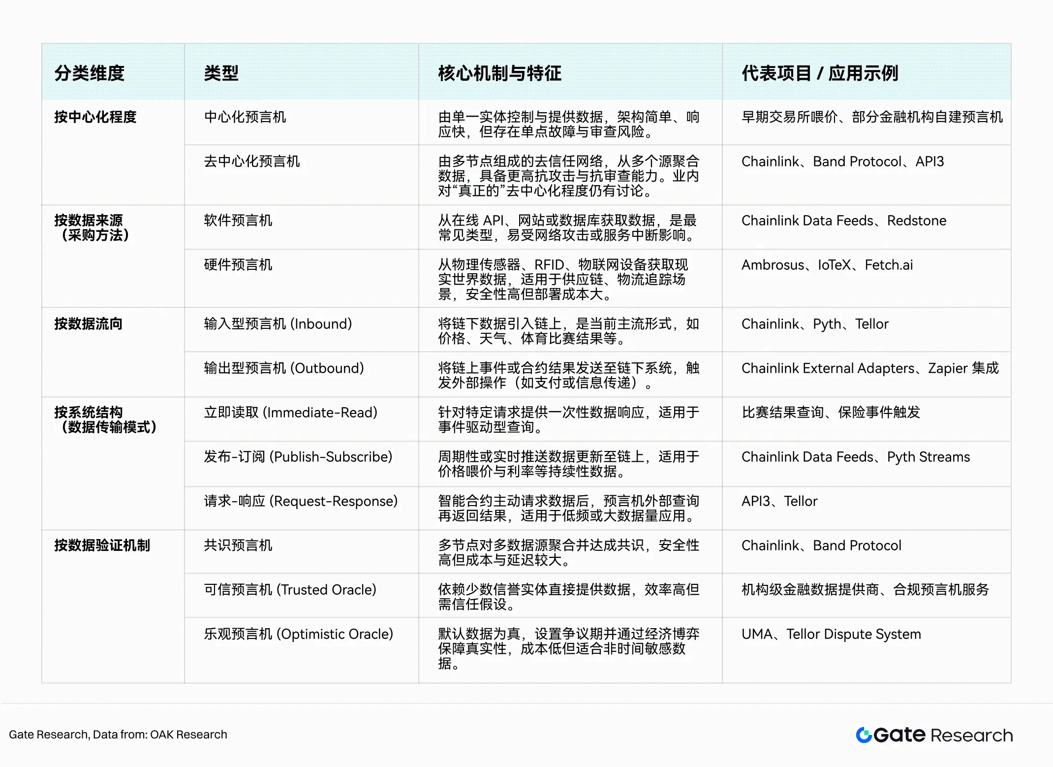 为了更全面地理解预言机的多样性与系统差异,可以从中心化程度、数据来源、数据流向、系统结构及验证机制等多个维度进行分类。不同维度体现了预言机在安全性、性能、信任模型及成本间的权衡,也反映出其在多样化 Web3 应用中的适配路径。