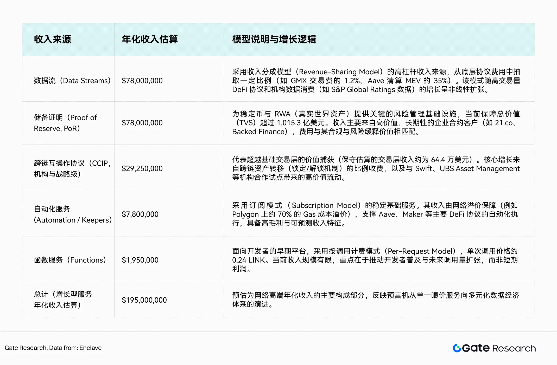 Chainlink 的核心收入结构已从单一喂价服务扩展为多维数据经济体系,回收的收入用于增强 LINK 质押奖励和网络可持续性。根据 Enclave 估算,2025 年网络收入约 1.95 亿美元,具体构成为: