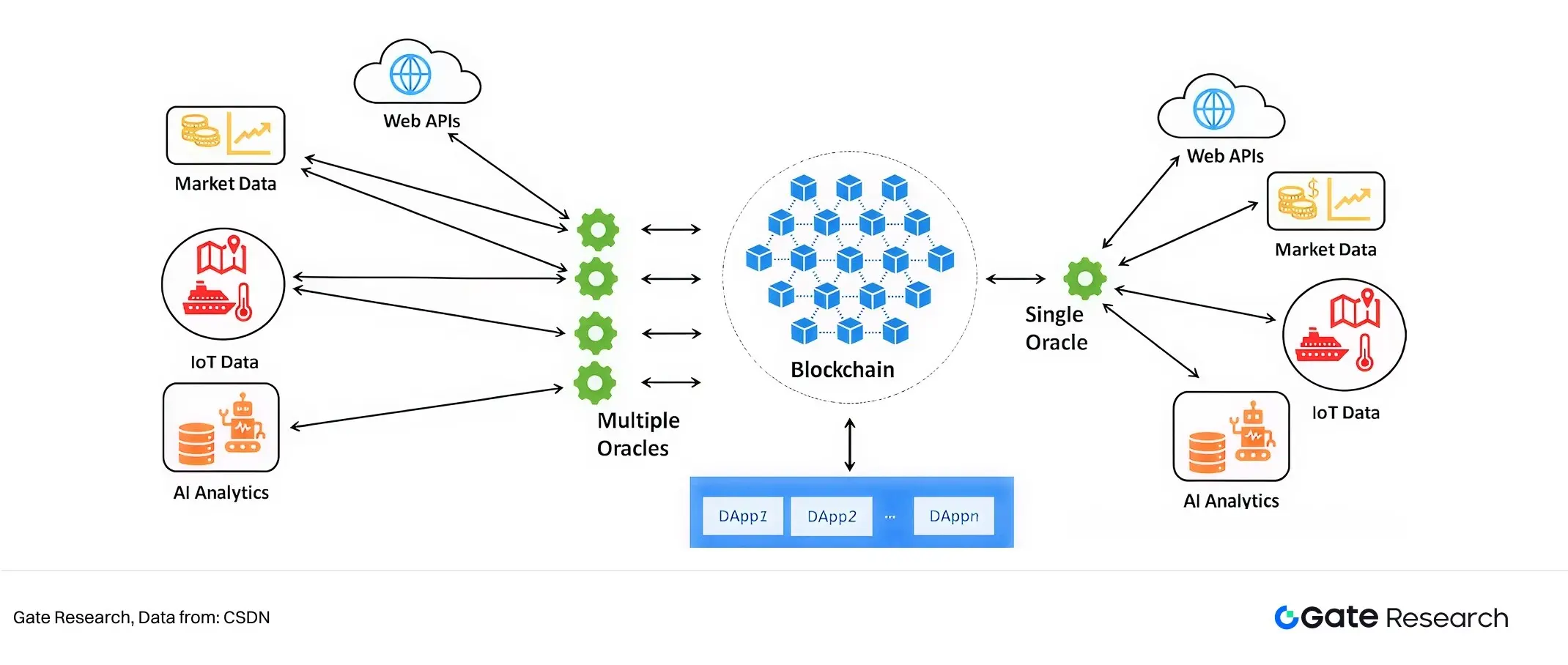 作者:Gate研究院 摘要● 预言机是连接区块链与现实世界的关键基础设施:它能够安全、透明地将链下数据(如价格、事件、资产状态等)引入链上,使智能合约具备感知与交互现实世界的能力,成为 Web3 生态的“信任引擎”和“数据结算层”。● 市场规模爆发:预...
