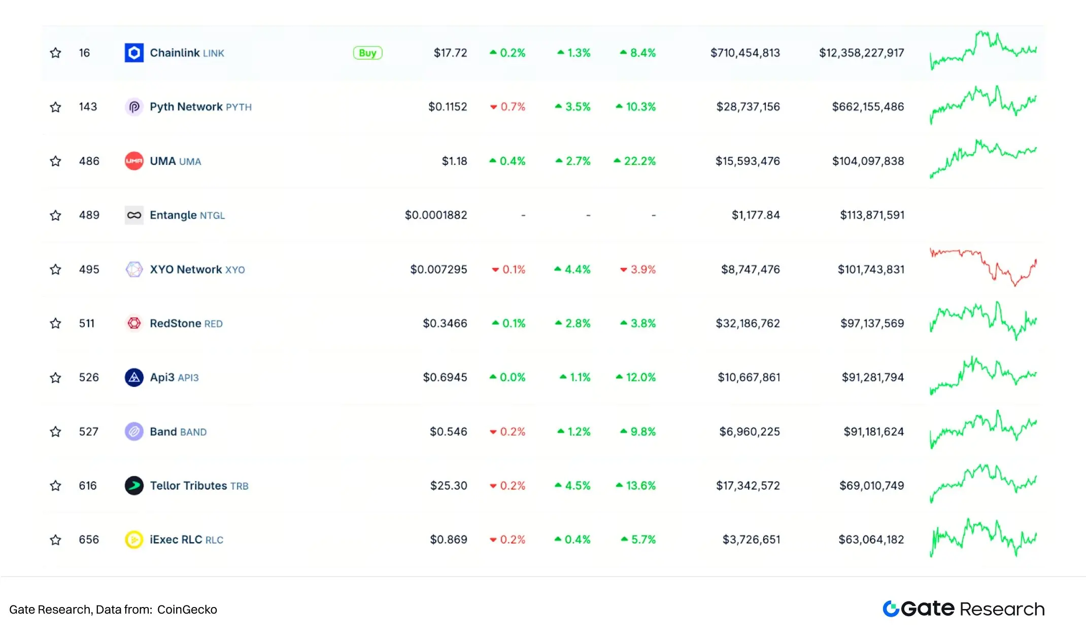 在市值结构方面,Chainlink 以超过 87% 的占比稳居行业主导,其市值约为 123 亿美元;其次为 Pyth Network(约 4.6%)、UMA(约 0.73%) 与 XYO(约 0.71%) 等协议。Chainlink 依托在 DeFi、跨链通信(CCIP)与储备证明(PoR) 等核心场景的深度整合,构筑了稳固的生态壁垒;而 Pyth、UMA 与 RedStone 等新兴协议,则通过在 高速数据分发、隐私计算 以及 第一方数据源机制等方面的创新,不断拓展差异化竞争空间。