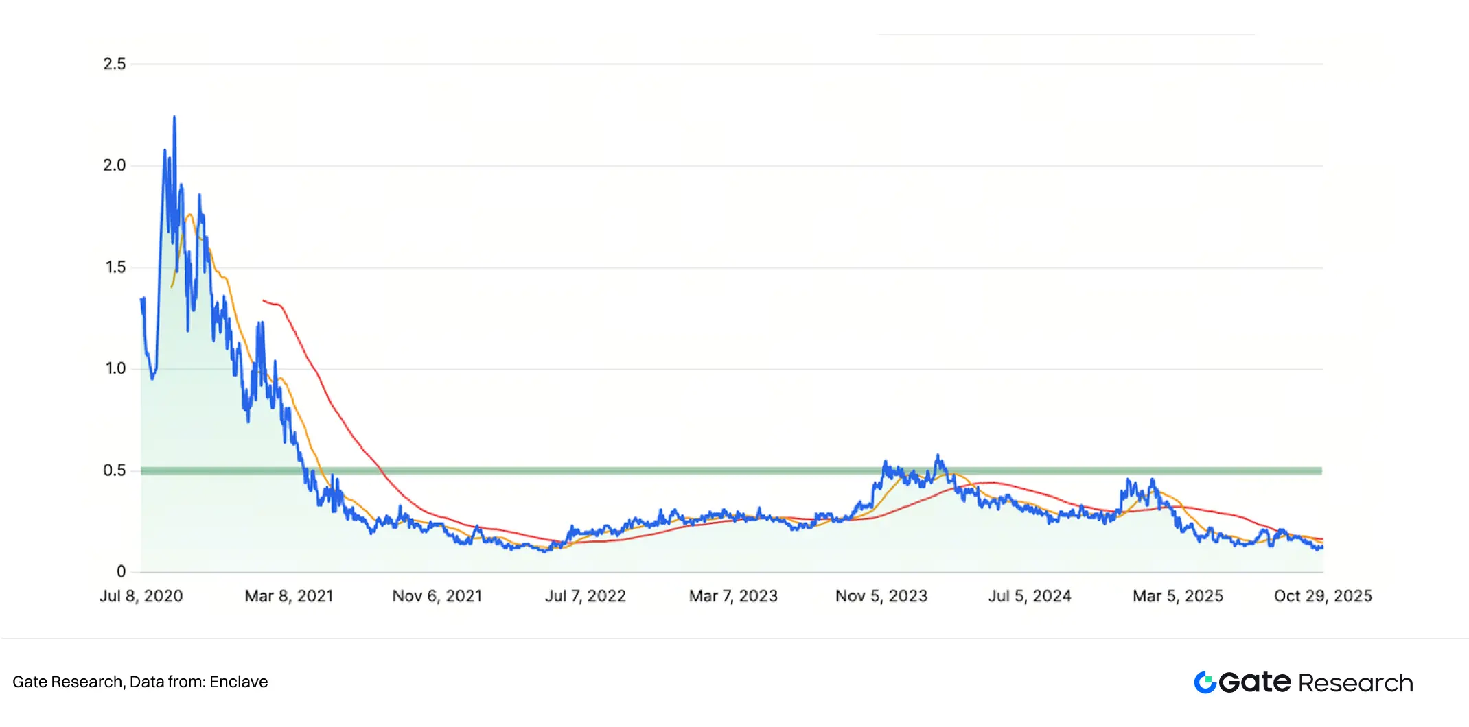 从估值结构来看,市值 / TVS(Market Cap / Total Value Secured) 已成为评估 LINK 合理价格的重要参考指标。自 2020 年至 2025 年,该比率由约 2.0 下降至 0.12,显示出市场估值重心从投机性向基本面回归。具体表现为: