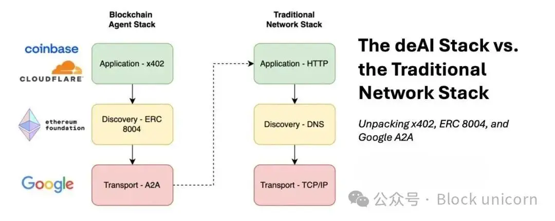如今,我们正看到去中心化人工智能(deAI)的“网络协议栈”在逐步构建起来。正如互联网运行在一系列可互操作的标准之上——传输层采用 TCP/IP,服务发现层采用 DNS,应用逻辑采用 HTTP——我们也可以将 deAI 协议栈分解为这三个模块:应用层采用 x402,服务发现层采用 ERC 8004,传输层采用 A2A——所有这些都运行在传统的 HTTP 网络协议栈之上。