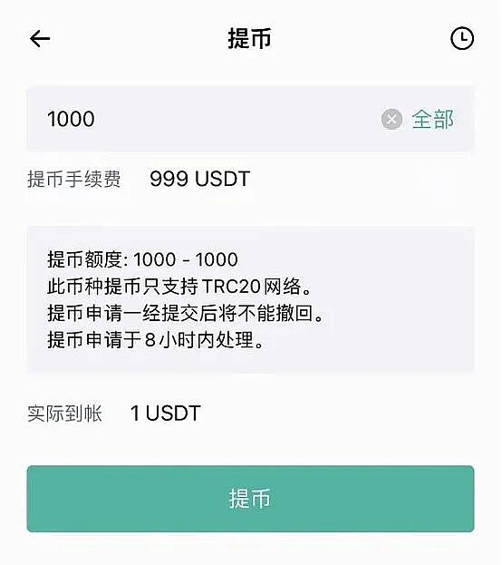 JPEX 用户截图,USDT 提现手续费飙升至 999 USDT(最高提现限额 1000 USDT)