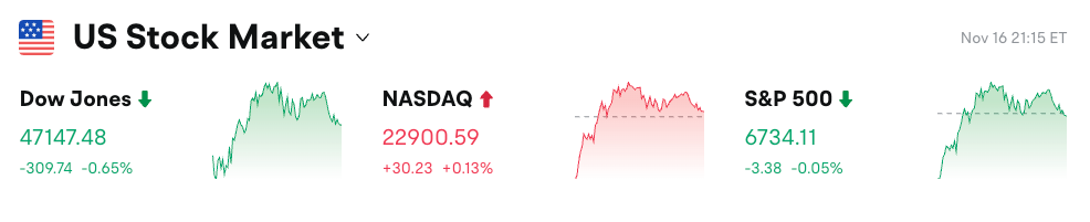 2、美股涨跌不一, 纳指涨0.13%,标普500跌0.05%,道指涨0.65%,市场关注AI板块估值及即将公布的经济数据;