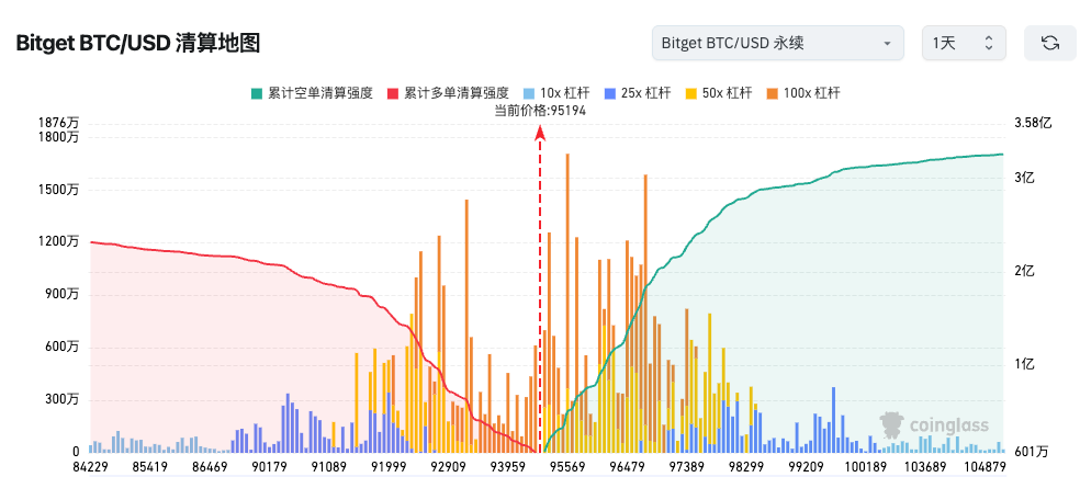 3、Bitget 清算地图显示,BTC 价格震荡于关键95,194美元区间,94,000–96,000美元为 最大清算密集区。