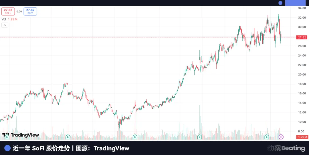 消息公布当天,SoFi 的股价直接冲上历史新高,市值来到 389 亿美元,年初至今的涨幅已达到 116%。