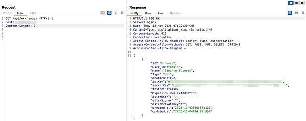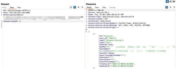 因此,该版本访问 /api/exchanges 虽需 Authorization,但攻击者仍可通过默认密钥创建 JWT 或调用默认登录接口获取 token,从而读取全部密钥。