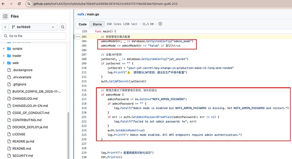 同一提交还新增了 /api/admin-login,要求部署者设置环境变量 NOFX_ADMIN_PASSWORD,也就是管理员模式不再是“无需登录自动生效”。如果 admin_mode 还是 true,main.go:203-226 会检查环境变量 NOFX_ADMIN_PASSWORD,并调用 log.Fatalf 直接终止进程,除非事先设置了该变量。设置完成后,管理员必须通过新的 /api/admin-login 接口提交这个密码才能拿到 JWT;没设密码就启动,会在初始化阶段被强制退出。