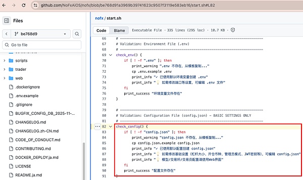 若开发者直接使用示例配置文件,将导致默认密钥被启用,从而存在安全风险。而项目中的的默认部署脚本 start.sh 文件在检测到缺失配置时,会直接复制示例配置文件来使用。