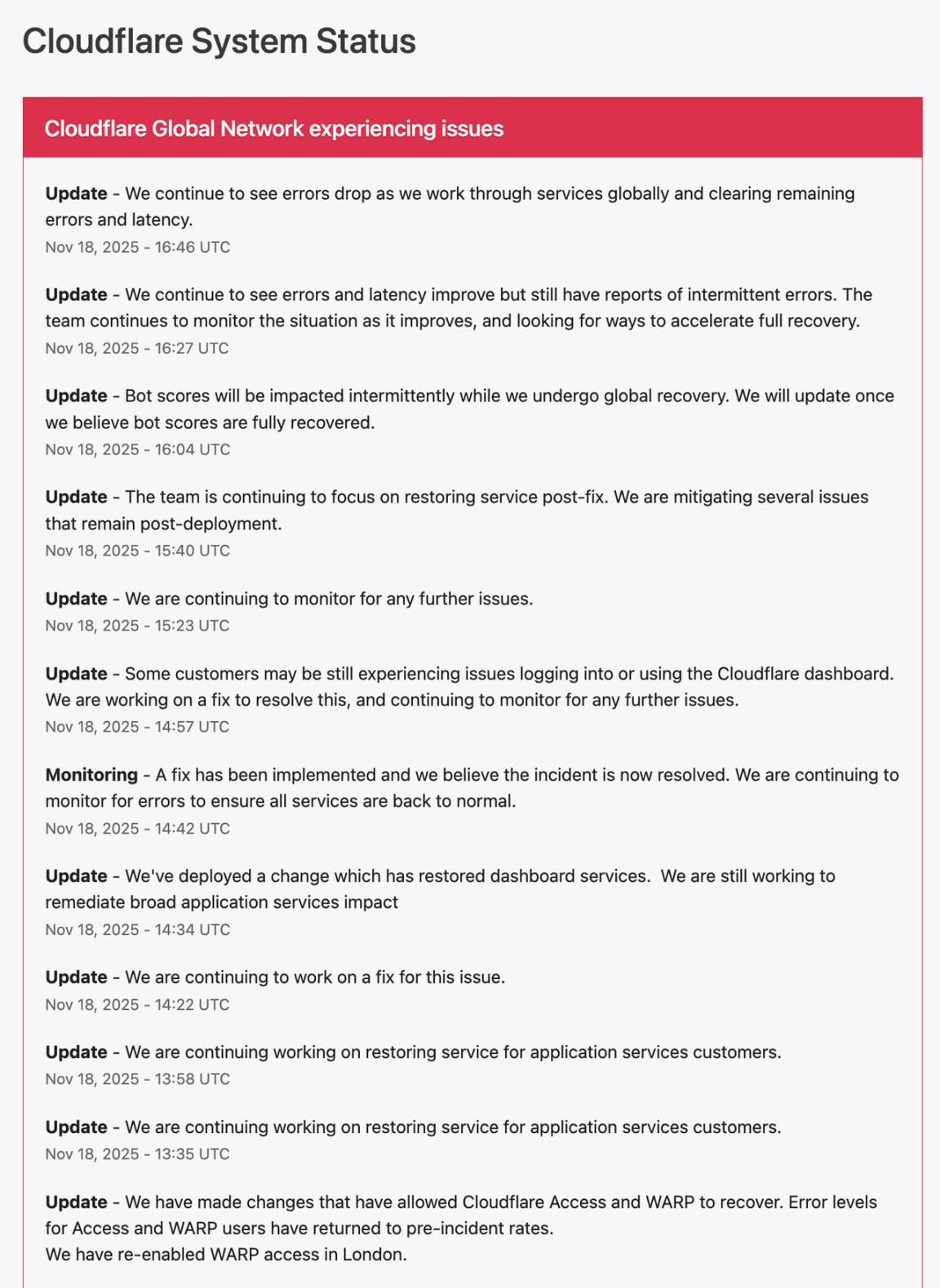 到美东时间 12:15,Cloudflare 表示系统正在逐步恢复,但全球部分区域仍可能出现访问错误、性能下降或登录问题。公司将在状态页面持续更新修复进度。