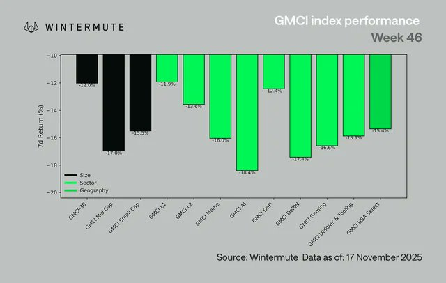 从行业层面来看,表现普遍负面。GMCI-30指数(@gmci_)下跌12%,大多数板块跌幅在14%-18%之间,领跌的板块包括人工智能 (AI)、去中心化物联网 (DePIN)、游戏 (Gaming) 和表情包币 (Memes)。即便是通常更具韧性的类别,例如第一层网络 (L1s)、第二层网络 (L2s) 和去中心化金融 (DeFi),也出现了广泛弱势。这次市场波动表现出全面的风险规避,而非板块轮动。