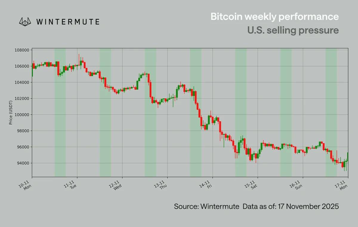 比特币 (BTC) 再次跌破10万美元关口,这是自5月以来首次出现的情况。在上周之前,比特币曾两次成功守住10万美元水平(分别为11月4日和7日),甚至在上周初短暂反弹至11万美元。然而,这种反弹在美国交易时段迅速消退,小时图蜡烛显示出明确的卖压模式——每当美国市场开盘,卖盘便涌现,最终在两次试探后跌破10万美元。