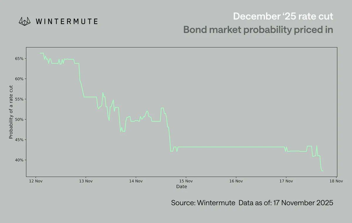 上周市场的焦点在于消化12月降息预期的突然重新定价。降息概率在短短一周内从约70% 骤降至 42%,这一变化因缺乏其他宏观数据而被进一步放大。美联储主席鲍威尔对几乎确定的12月降息表示回撤,迫使投资者重新审视各个FOMC(联邦公开市场委员会)成员的观点,揭示出降息并非共识。市场反应迅速:美国风险资产走软,而加密货币作为最受情绪影响的风险资产,受创尤为严重。