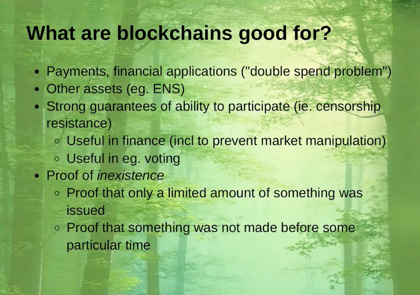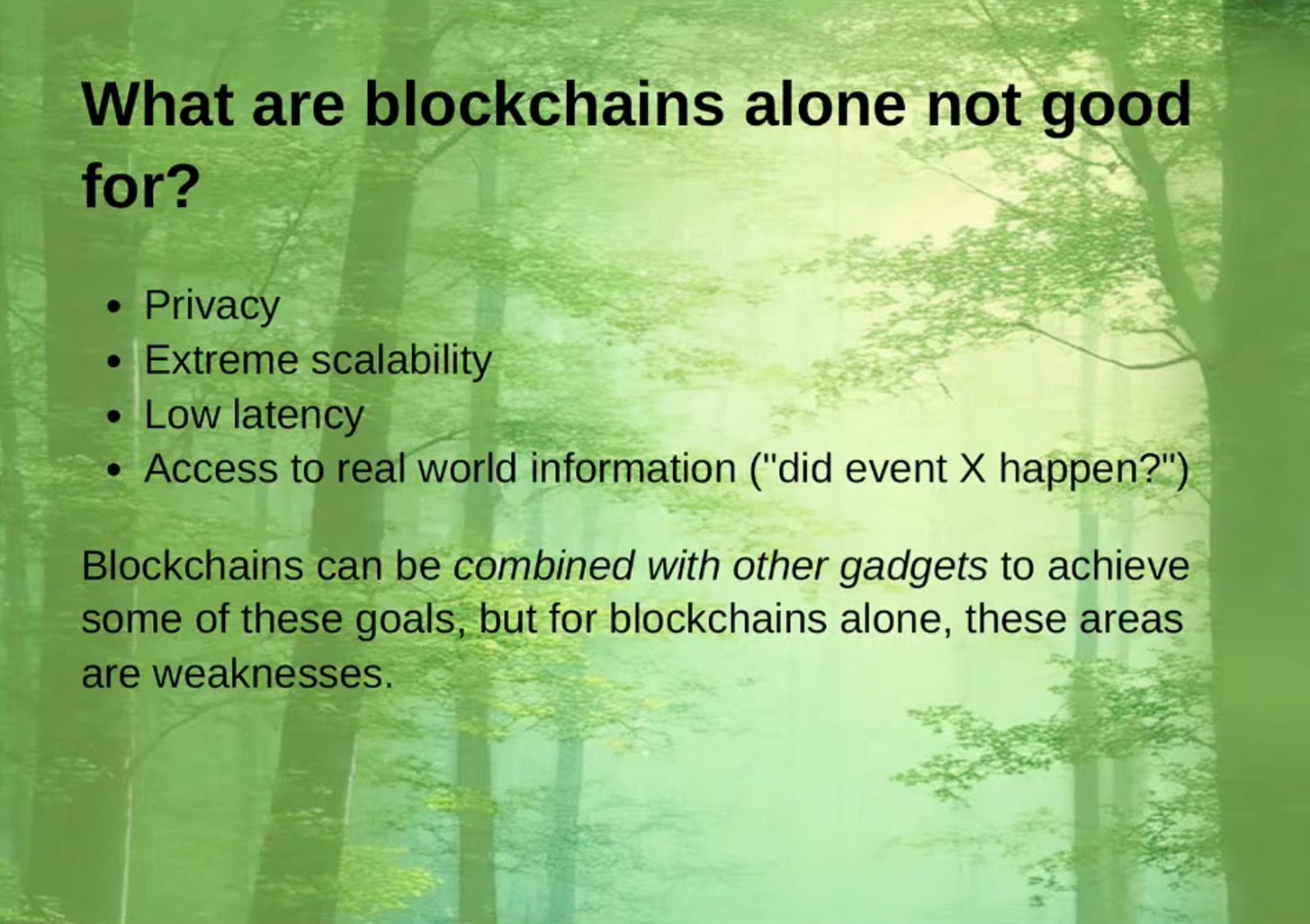 区块链可以与其他的「小工具」(gadgets)结合来实现这些目标,但对于区块链本身而言,这些领域是弱点。