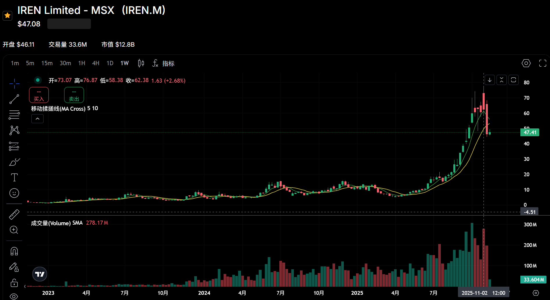 市场也早已对矿工股转型 AI 的估值逻辑切换作出反应,像矿企转型 AI 的标志性样本 Iris Energy(IREN),股价在年内从 6 美元左右一度摸至 76.87 美元,涨幅逾 1200%。