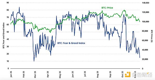 过去30天的价格走势对比特币持有者来说尤其不利,由于抛售压力巨大,比特币价格下跌了13%。自2025年10月10日以来,比特币ETP的余额减少了4.93万枚,约占总资产管理规模的2%。那些在价格接近峰值时买入的弱手在降息不确定性和人工智能发展前景不明朗的情况下纷纷抛售。更令人担忧的是,许多人将价格疲软的矛头指向了早期的比特币“巨鲸”。例如,一位“中本聪时代”的巨鲸在11月14日当周抛售了价值15亿美元的比特币,几乎清空了他的整个钱包。许多人认为,资深巨鲸往往会在比特币的关键节点通过买入或卖出比特币来预示长期走势。因此,加密货币社区的情绪变得悲观,恐慌/贪婪指数跌至2025年3月关税风波爆发以来的最低水平。