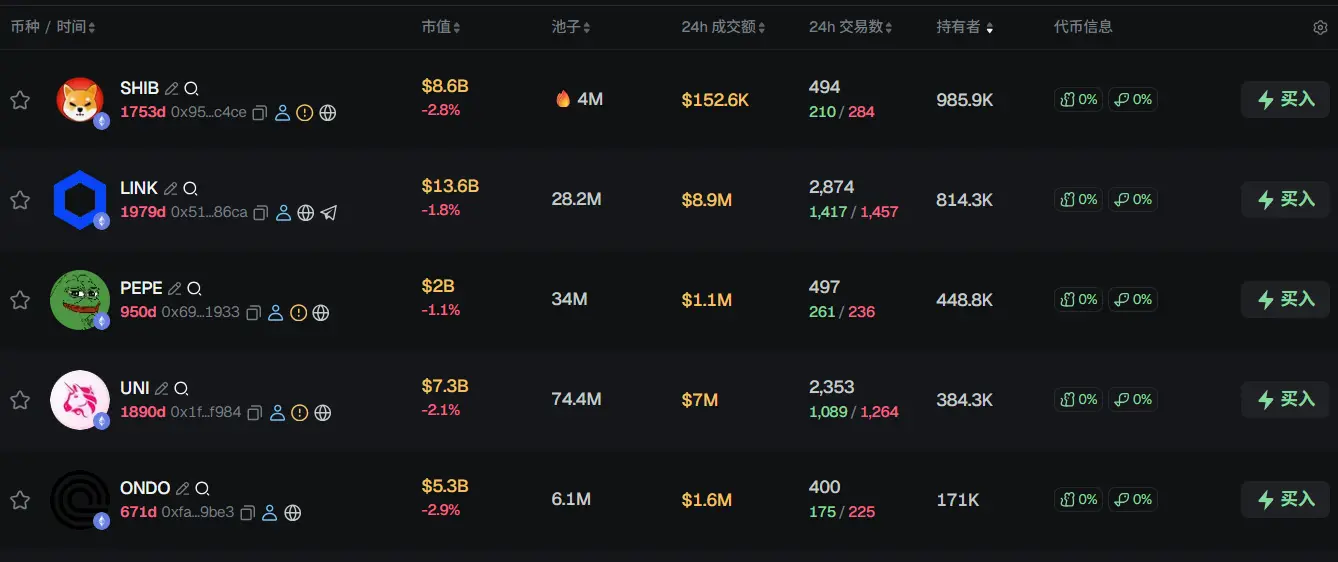 过去 24h ETH 热门代币前五依次为:SHIB、LINK、PEPE、UNI、ONDO