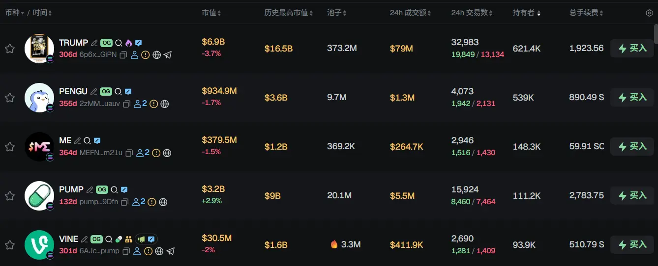 过去 24h Solana 热门代币前五依次为:TRUMP、PEENGU、ME、PUMP、VINE