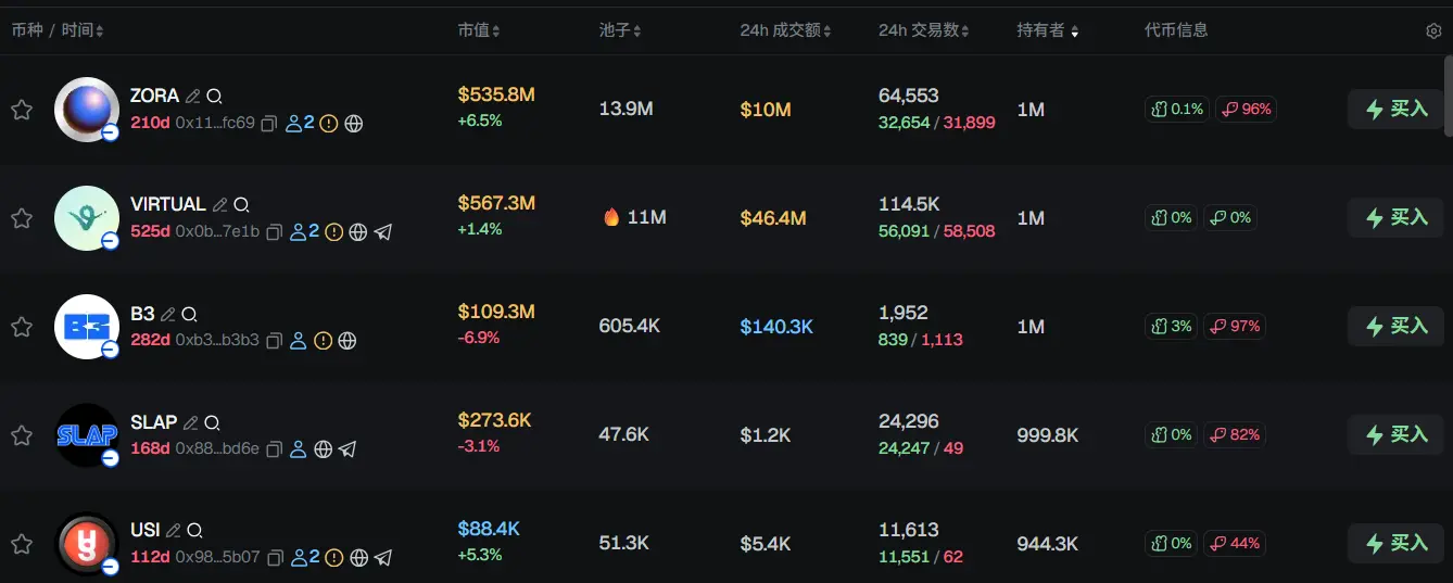 过去 24h Base 热门代币前五依次为:ZORA、VIRTUAL、B3、SLAP、USI