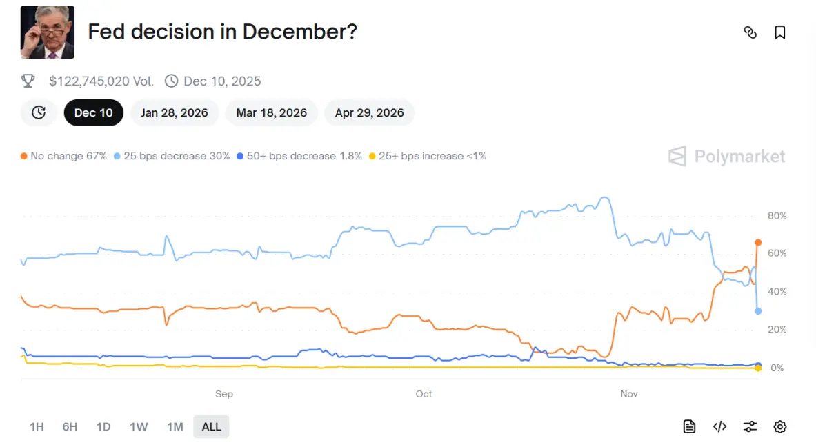 CME FedWatch 工具最新数据显示,12 月降息 25bp 的概率已从两周前的 95% 暴跌至当 28%。Polymarket 最新数据显示,市场押注今年 12 月美联储降息 25 个基点的概率已跌至 30%,不降息的概率升至 67%。